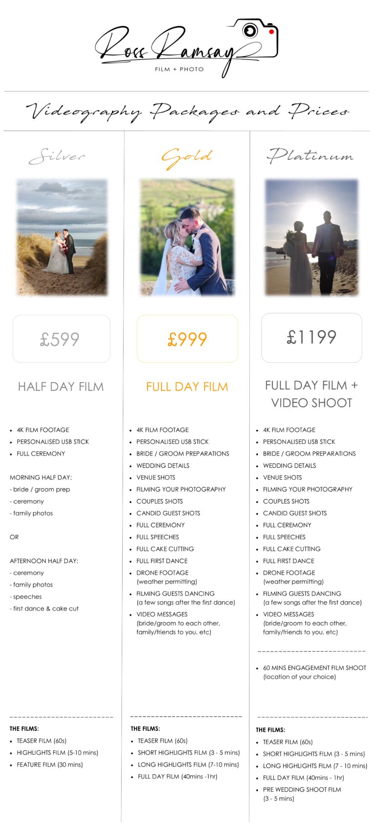 My current 2025/2026/2027 wedding videography prices are as follows: